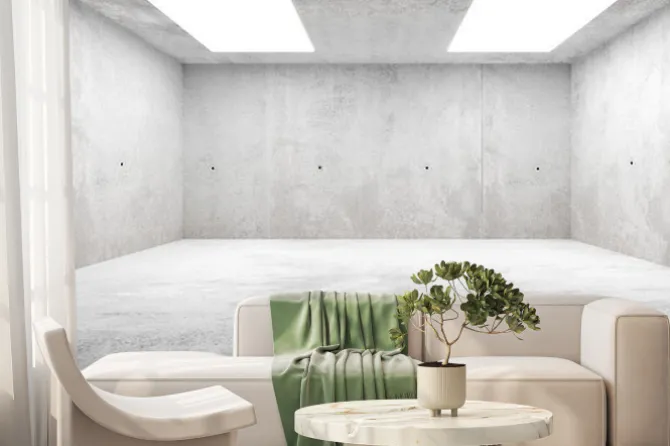 Abstract empty, modern concrete room with ceiling lights and rough floor – industrial interior background template, 3D illustration.