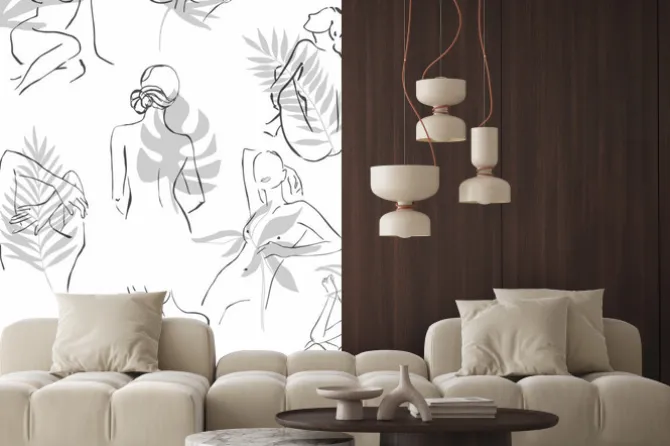 Fototapeta: Abstract womens silhouette minimalist line and tropical palm