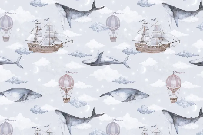 Akwarelowy motyw z wielorybami statkami i balonami na tle nieba.