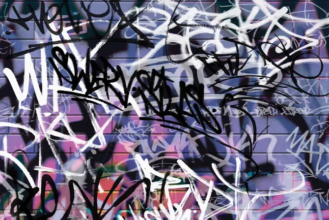 Artystyczne napisy na fioletowej ceglanej ścianie.