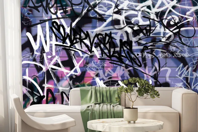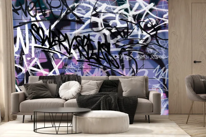 Fototapeta: Artystyczne napisy na fioletowej ceglanej ścianie