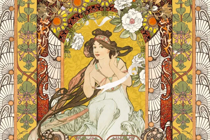 Artystyczny wizerunek portret kobiety inspirowany Alfonsem Muchą.