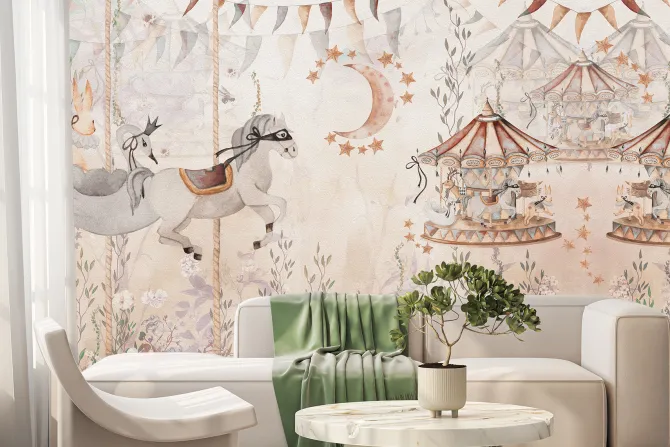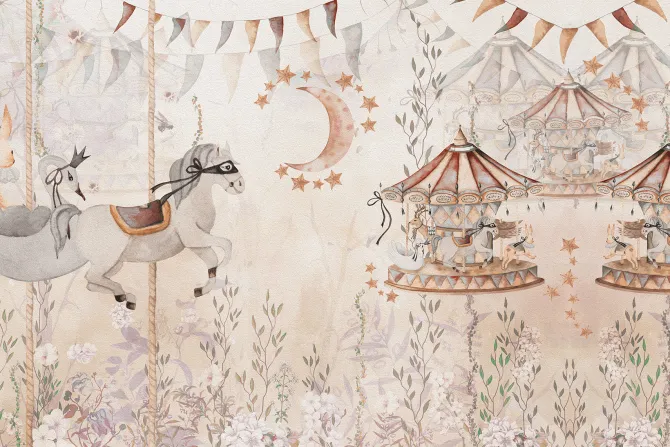 Fototapeta: Bajkowa roślinność z karuzelami i końmi