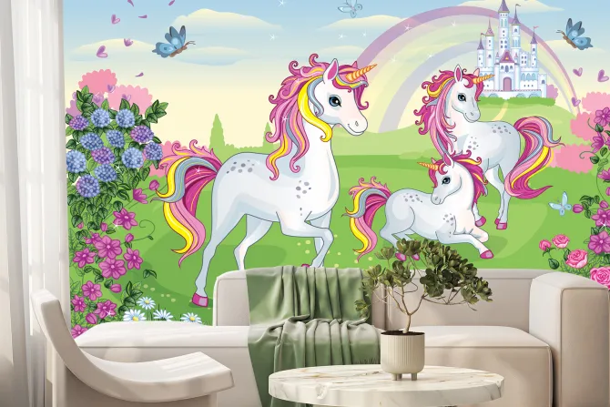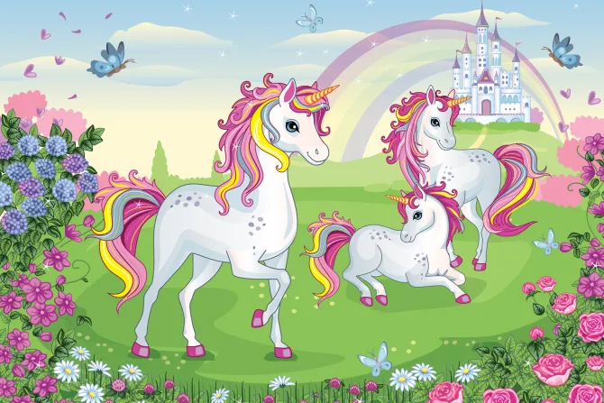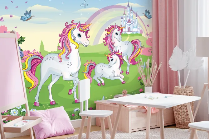 Bajkowe jednorożce wśród kwiatów z zamkiem i tęczą.