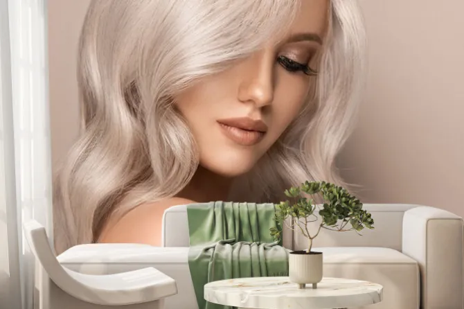 Beautiful girl with hair coloring in ultra blond. Stylish hairstyle curls done in a beauty salon. Fashion, cosmetics and makeup.