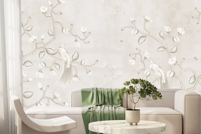 Beżowy motyw z ptakami na gałązkach magnolii.