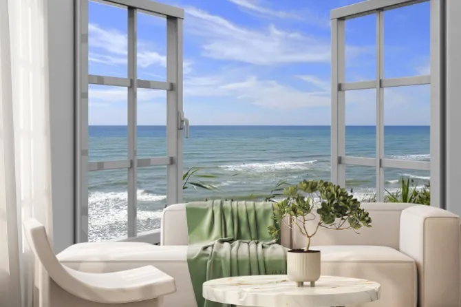 Fototapeta: Błękitne niebo i morze widziane z okna