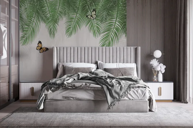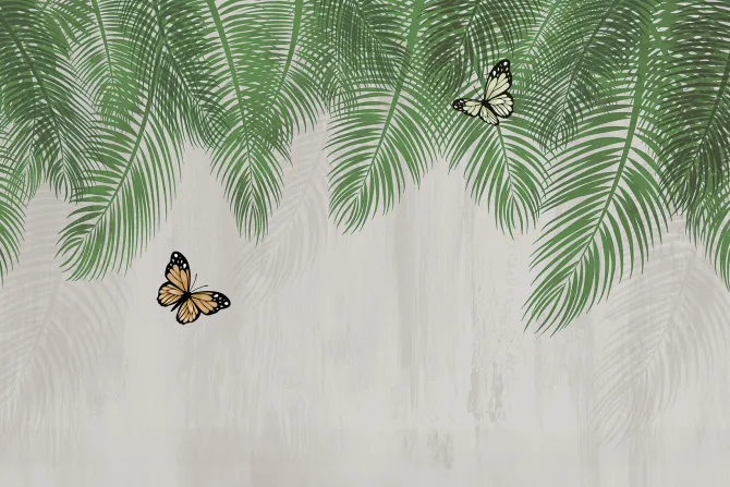 Fototapeta: Botaniczny wzór zielone liście palmowe z motylami na tle z teksturą