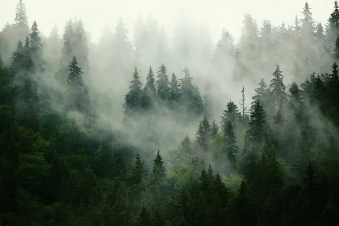 Fototapeta: Ciemnozielony las iglasty we mgle