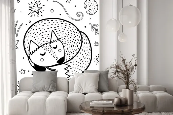 Fototapeta: Cute sleeping fox coloring page. black and white print with funny