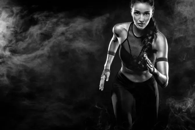 Fototapeta: Czarno-białe zdjęcie biegnącej kobiety