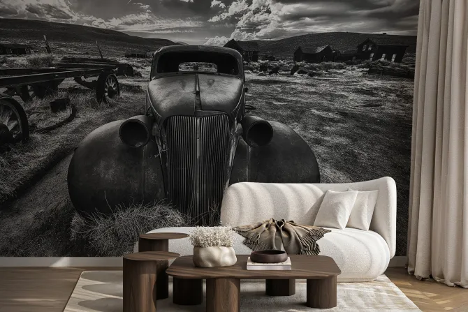 Fototapeta: Czarno-białe zdjęcie wraku samochodu