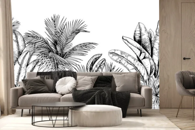 Czarno biały wzór z palmami i liśćmi bananowca.