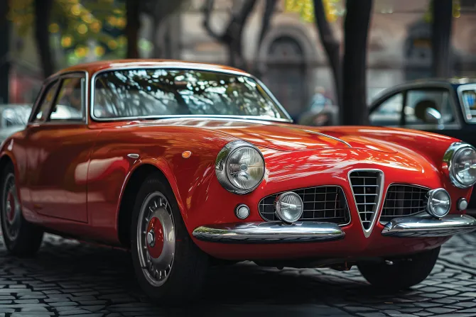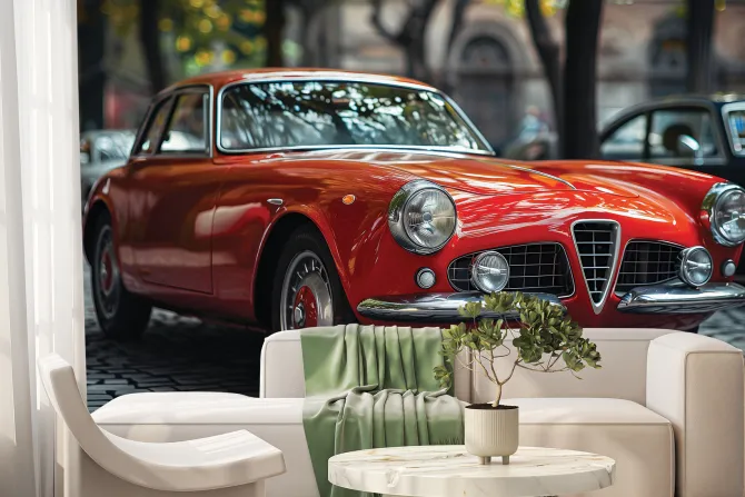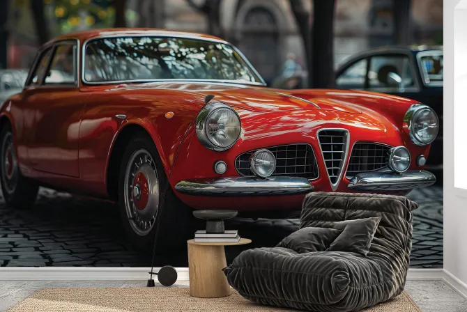 Fototapeta: Czerwony klasyk w miejskiej scenerii