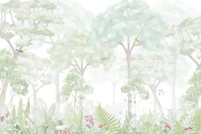 Fototapeta: Delikatny krajobraz lasu z ptakami