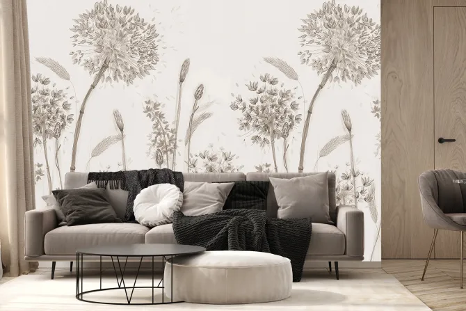 Dmuchawce i delikatne rośliny polne beżowa grafika w stylu minimalistycznym.