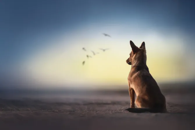 niebo, ptaki, ptak, zachód słońca, morze, piasek, plaża, psy, pieski
