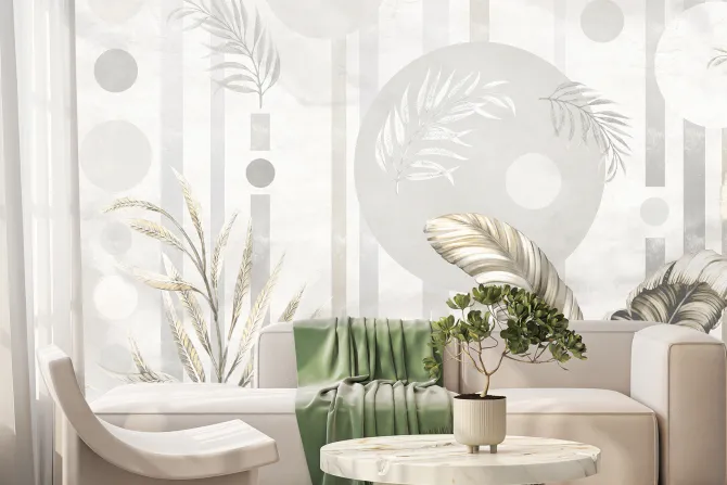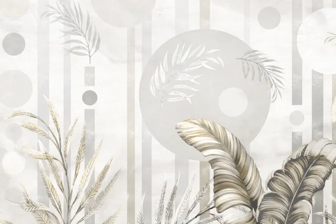Egzotyczne liście na tle z figurami geometrycznymi.