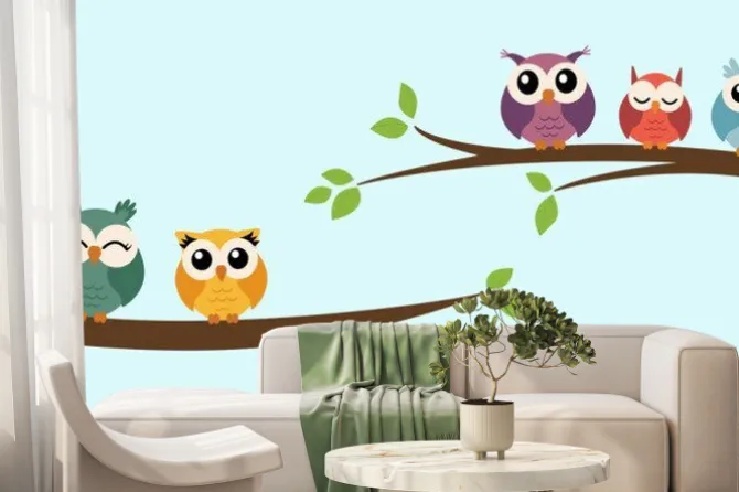 pokój dziecięcy, przedszkole, sypialnia, niebo, ptak, liść, sowa, rysunek, zwierzęta