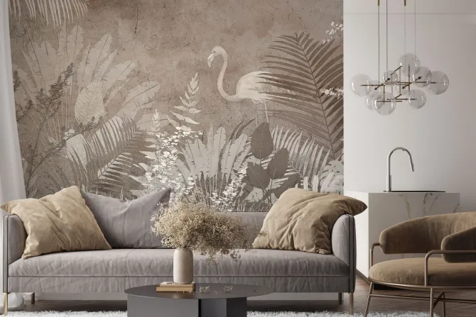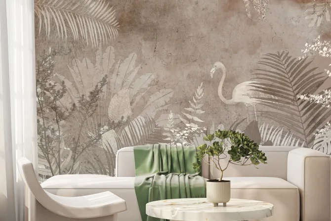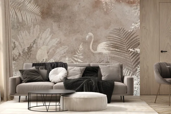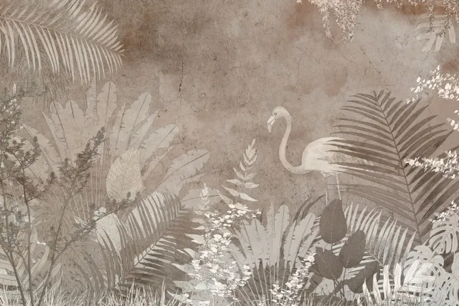 Flaming i tropikalne liście w odcieniach brązu na betonowym tle.