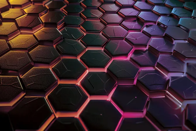 Geometryczny wzór z czarnymi heksagonami i neonowym światłem.