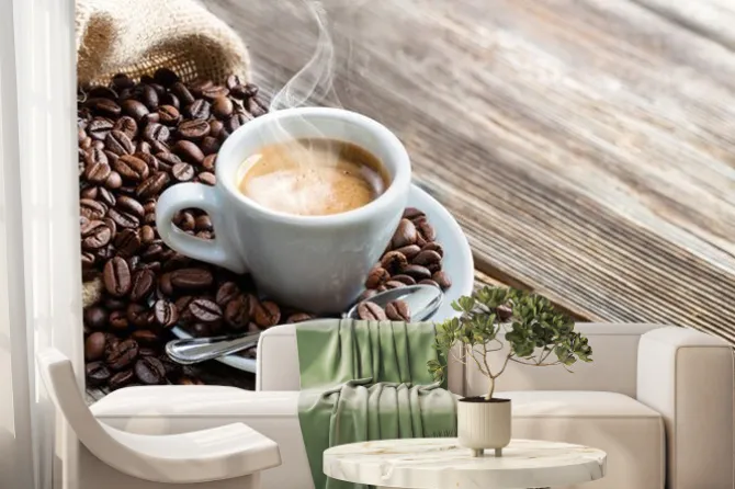Fototapeta: Gorące espresso i rozsypane ziarna kawy na drewnianym stole