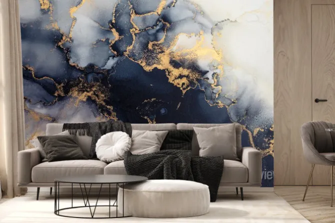 Fototapeta: Granatowo-biały marmur ze złotawymi zdobieniami