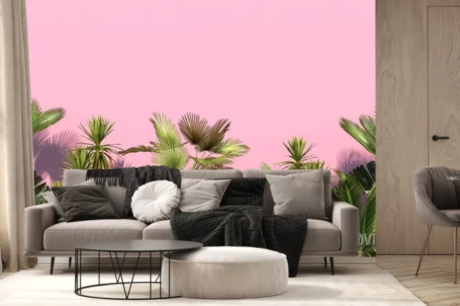 Fototapeta: Green palm trees and tropical exotic plants on a pink background