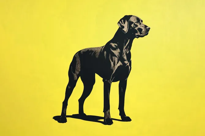 Ilustracja czarny pies grafika zwierzę na żółtym tle.
