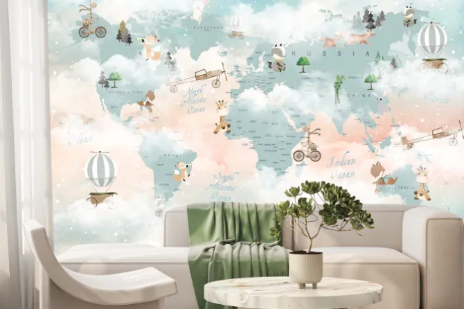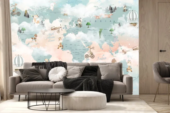 Ilustracja edukacyjna z mapą świata do pokoju dziecięcego.