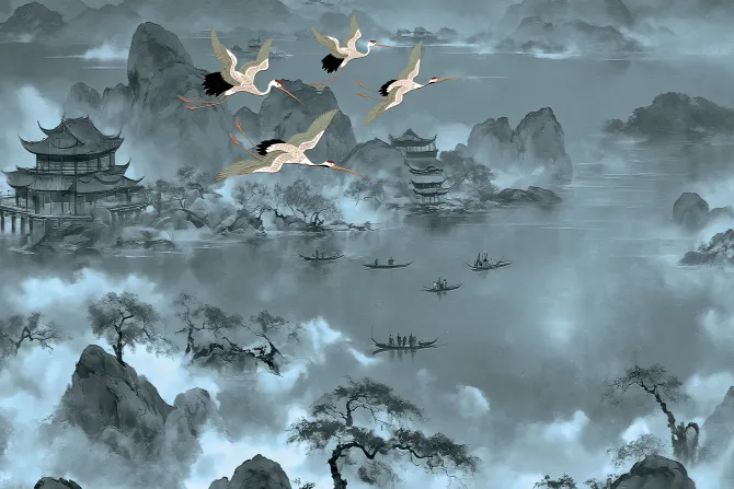 Japoński krajobraz jeziora z gondolami i ptakami.