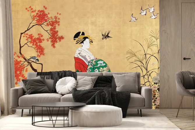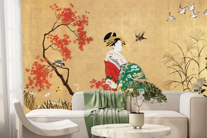 Fototapeta: Japoński ogród z kobietą i ptakami