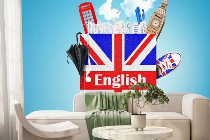 Język angielski tekst książki z brytyjskiej flagi i parasol.
