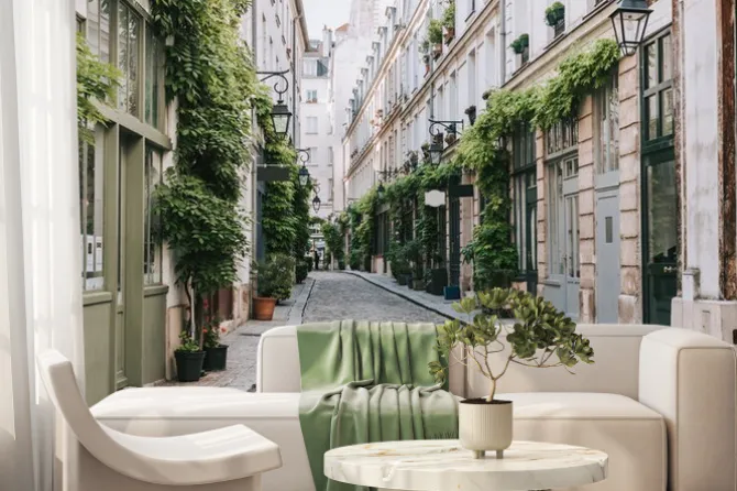 Kamienica w Paryżu pokryta zielonym bluszczem.