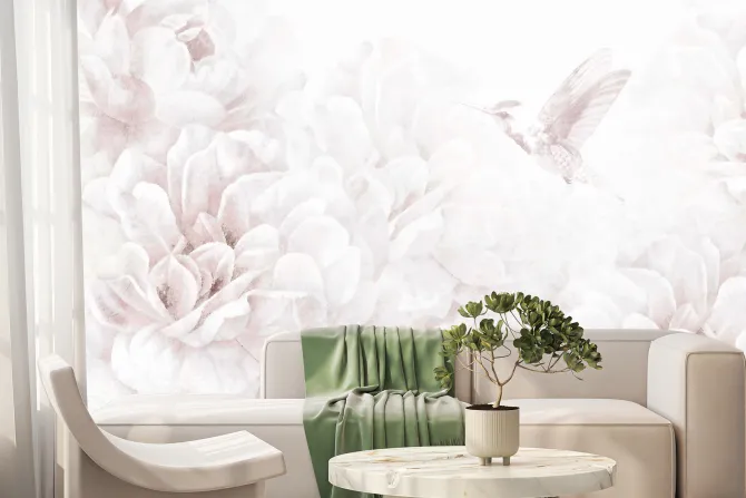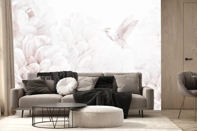 Fototapeta: Koliber wśród pastelowych kwiatów piwonii