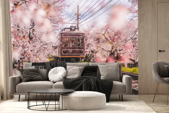 Fototapeta: Krajobraz z pociągiem i kwitnącą wiśnią w kioto