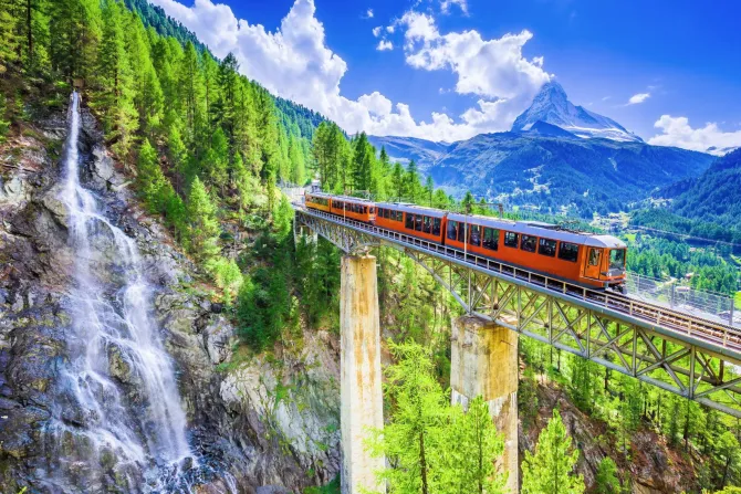 Fototapeta: Krajobraz z wodospadem i pociągiem na moście