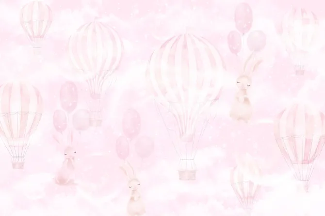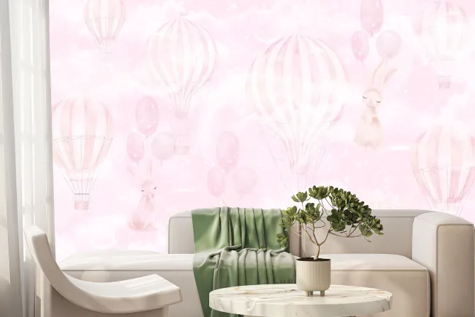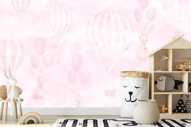 Fototapeta: Króliki z balonami na tle różowego nieba akwarela