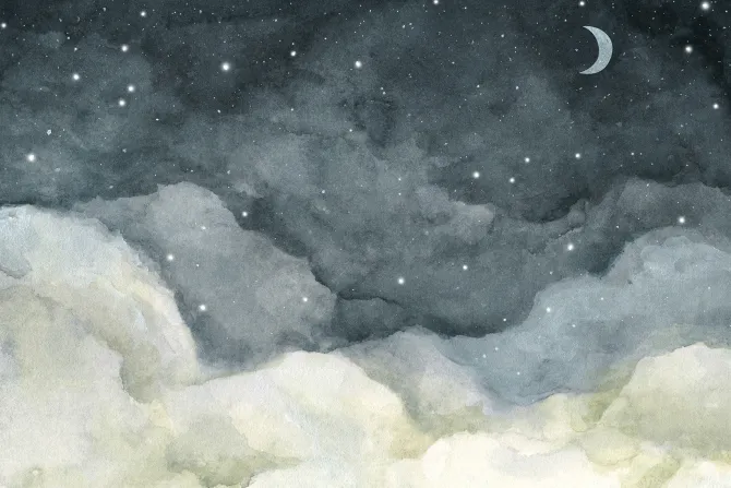 akwarela, gwiazdy, księżyc, gwiaździste niebo, nocne niebo, niebo, chmury