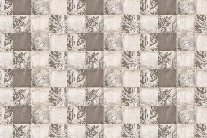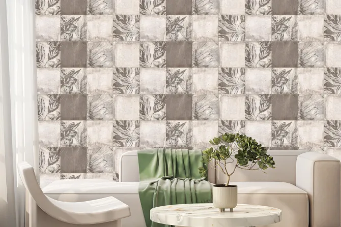 Kwadratowe płytki z botanicznym motywem.