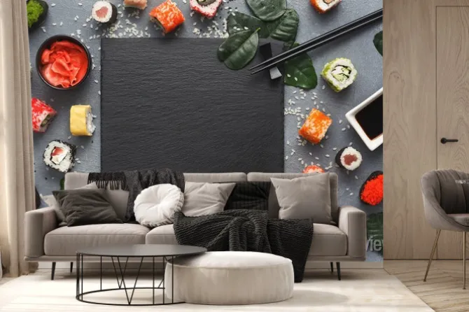 Fototapeta: Kwadratowy czarny łupek z sushi na szarym tle