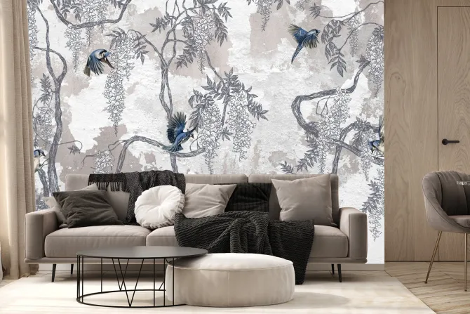 Fototapeta: Kwiatowe drzewa z ptakami na betonie