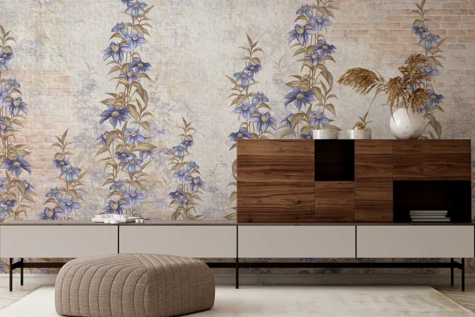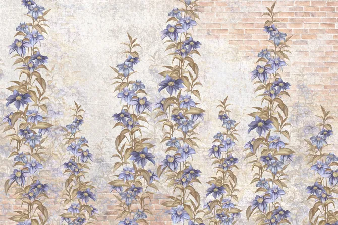 Fototapeta: Kwiaty w odcieniach niebieskiego na ceglanej ścianie