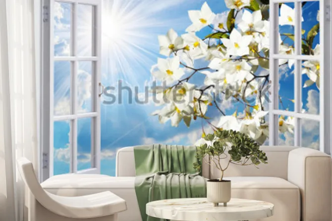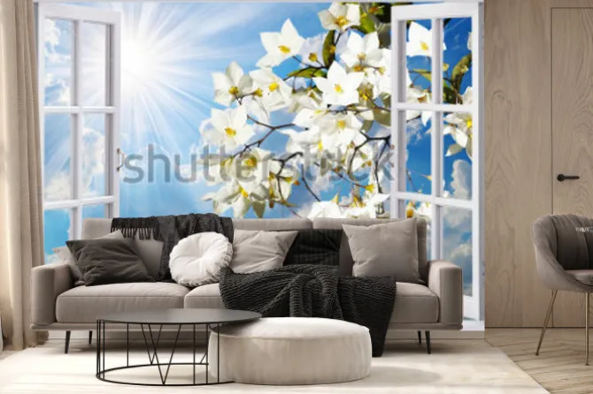 Fototapeta: Kwitnące gałązki za oknem