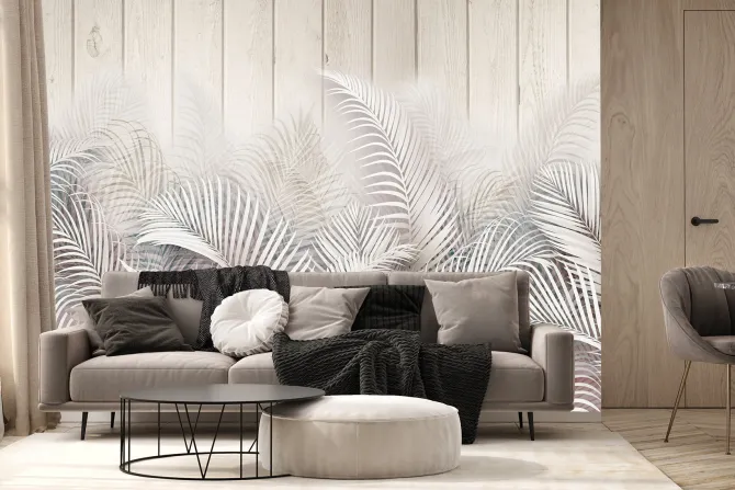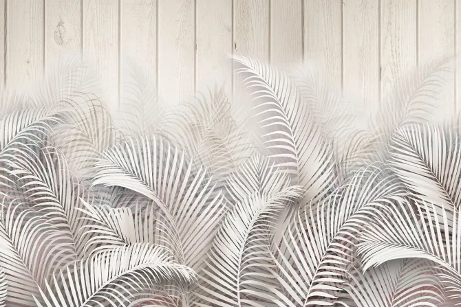 Fototapeta: Liście palm na drewnianych deskach