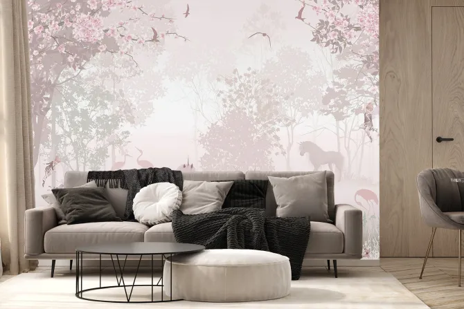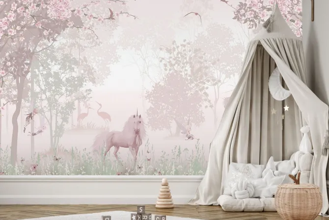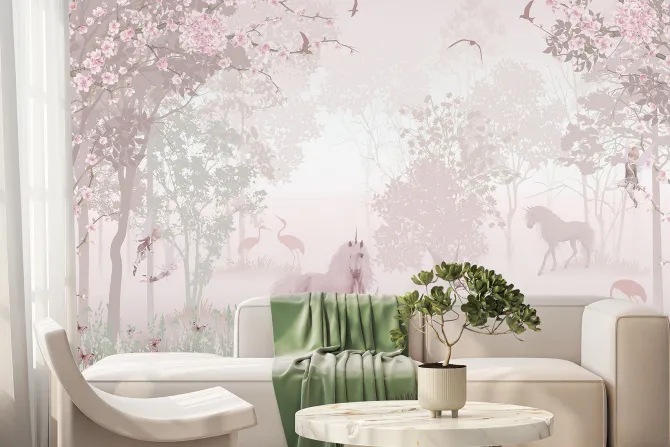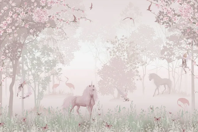 Fototapeta: Magiczny różowy las z jednorożcami i wróżkami