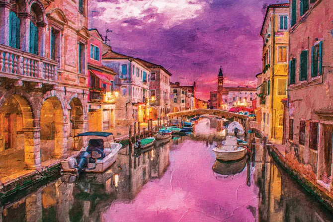 Fototapeta: Malowana wenecja z łódkami na tle katedry
