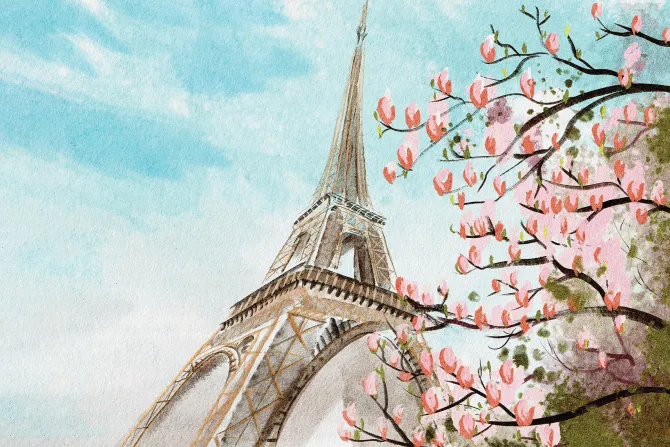 Malowany kwiat wiśni na tle wieży Eiffla.