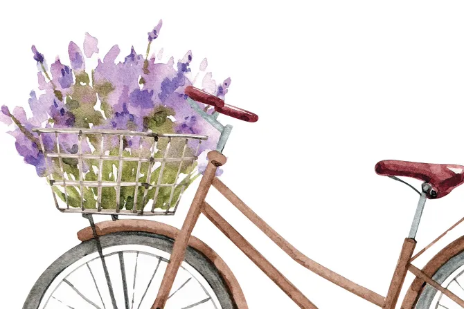 fioletowy kwiat, kwiaty, wrzos, malarstwo, koła, koło, rowery
