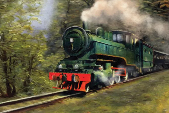 Fototapeta: Malowany wzór z pociągiem wśród lasu